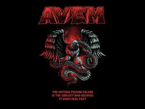 AVEM Logo w/ "THE MOTHER FUCKING FALCON IS THE COOLEST BIRD BECAUSE IT DIVES REAL FAST"